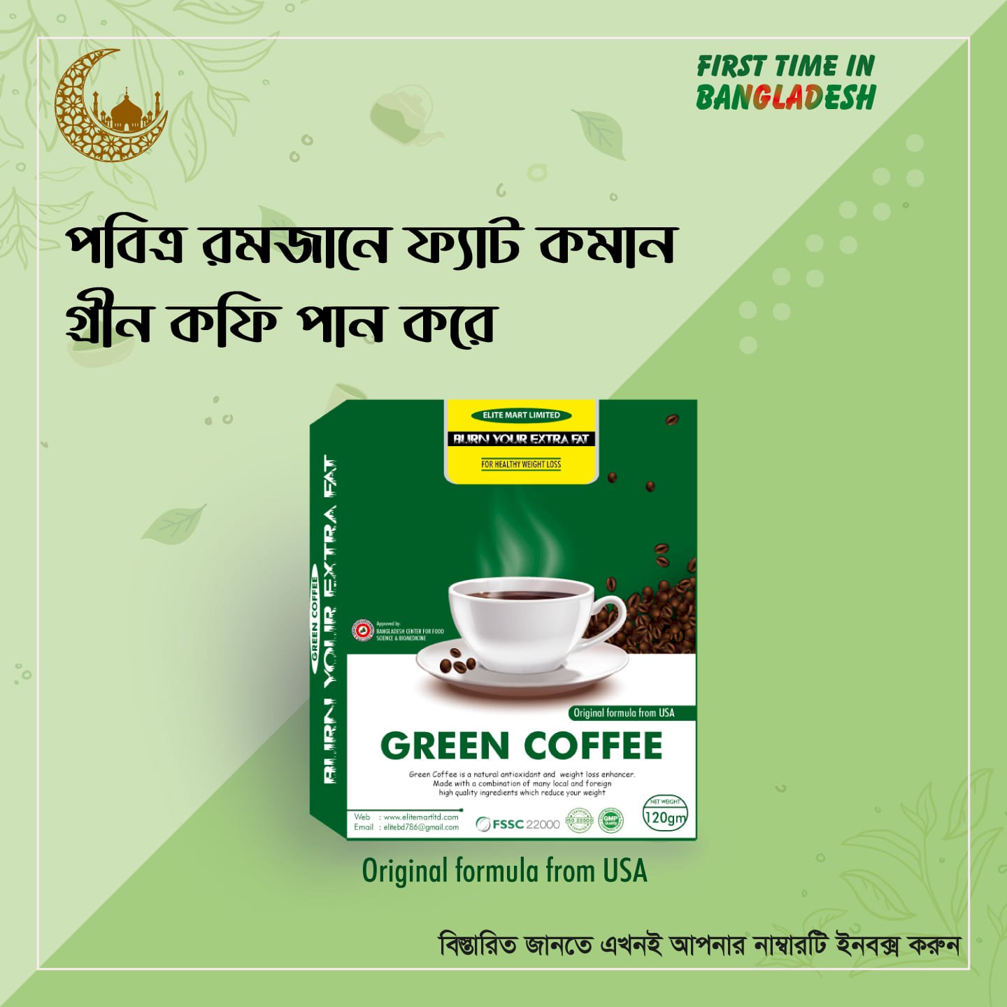 আমেরিকা, সিঙ্গাপুর,ইন্ডিয়ার পর এবার বাংলাদেশে প্রথমবারের মত আমরা নিয়ে এসেছি Green Coffee যা শরীরের শতভাগ ফ্যা^ট ঝেড়ে ফেলতে সক্ষম সম্পূর্ণ প্রাকৃতিক উপায়ে। এটি শতভাগ ন্যাচারাল ফর্মুলা দিয়ে তৈরি যা শরীরে এন্টি অক্সিডেন্টের পরিমান বাড়িয়ে দ্রুত মে^দ কমাতে সক্ষম।