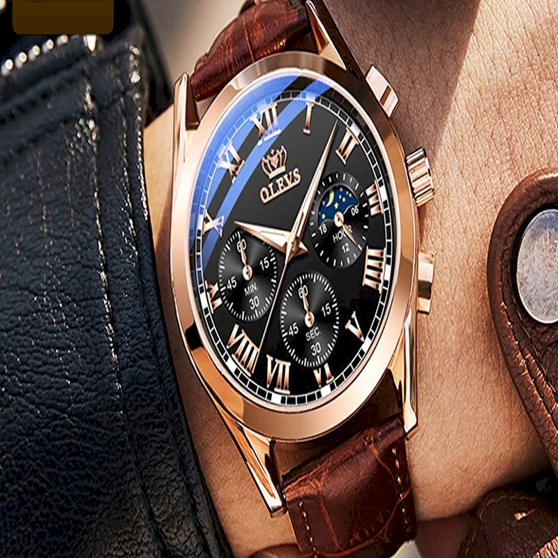 OLEVS Watch Men Quartz Original Relo Waterproof Genuine Leather Business Luminous 3D Sun Moon Star Multifunctional Design Calendar
