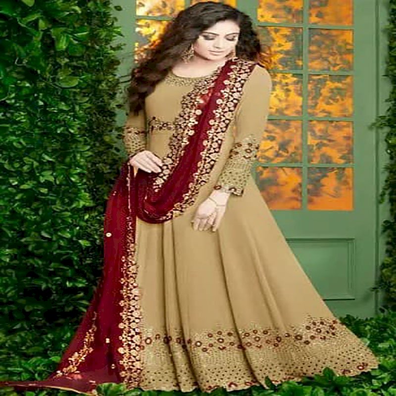 With Stone work, salwar (bottom) is 2.54mtr long with Pastel Green in colour and made by Santoon fabric. Dupatta of this dress is made by Georgette fabric which is also in Dark Peach color and the dupatta size is 2.2mtr long having Lace work. This dress is in Designer Suit style and we suggest you to First Wash Dry Clean Only for wash care.